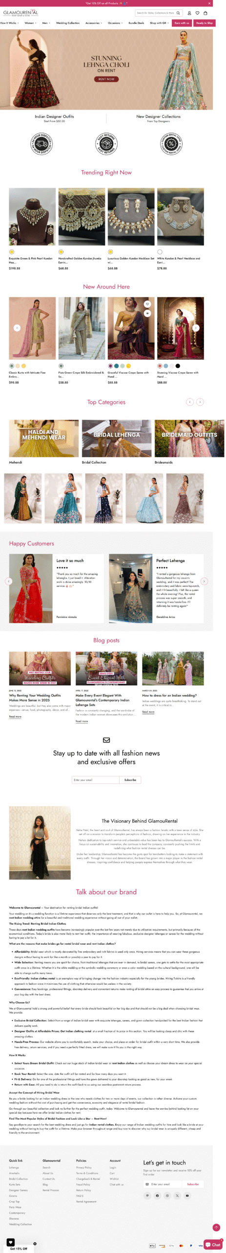 MadParrot created a polished, conversion-first Shopify website for Glamourental, a US-based ethnic wear rental brand founded in 2018. The platform showcases a wide range of Indian designer outfits—from bridal lehengas and party wear to matching jewelry—available for rent or purchase. The site designed by MadParrot uses clean navigation, high-impact visuals, and structured categories for occasions, designers, and collections. Featuring essential tools like size guides, rental durations, transparent policies, and seamless return workflows, the site is fully responsive, SEO-optimized, and built to convert. The end result is a refined digital experience that elevates brand trust, supports global orders, and simplifies rental fashion in a sustainable, stylish way.
